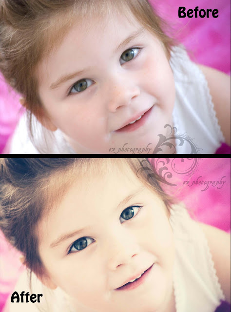 One great reason, lots of photos can come out underexposed. This means that the picture is alot darker than it should be. One spot that is usually darker are the whites of the eyes. A professional can come in and lighten up the photo so it looks great! The picture above is a great example of this. The before is SOOC (straight out of camera). Notice how it's underexposed and the eyes are very dark? Take a look at the after. The skin is lightened up and has a bit of glamour glow to it. I also brightened the eyes. The left eye in the before is very dark where the pupil blends in with shadows, in the after you can see the whole pupil. The before picture is a great photo to start with but the after adds the extra sparkle it needs.